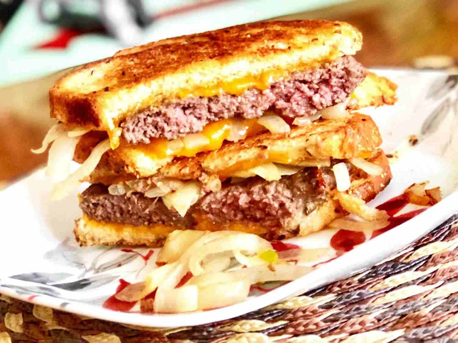 - Step 4:Place 3 slices bread mayonnaise-side down in the skillet. Top each with 1 slice of cheese, 1 beef patty, 1/3 of the onions, a second slice of cheese, and another slice of bread, mayonnaise-side up. Cook bread until golden brown and cheese has started to melt, 3 to 4 minutes. Flip each sandwich over and cook an additional 3 to 4 minutes. Yoly