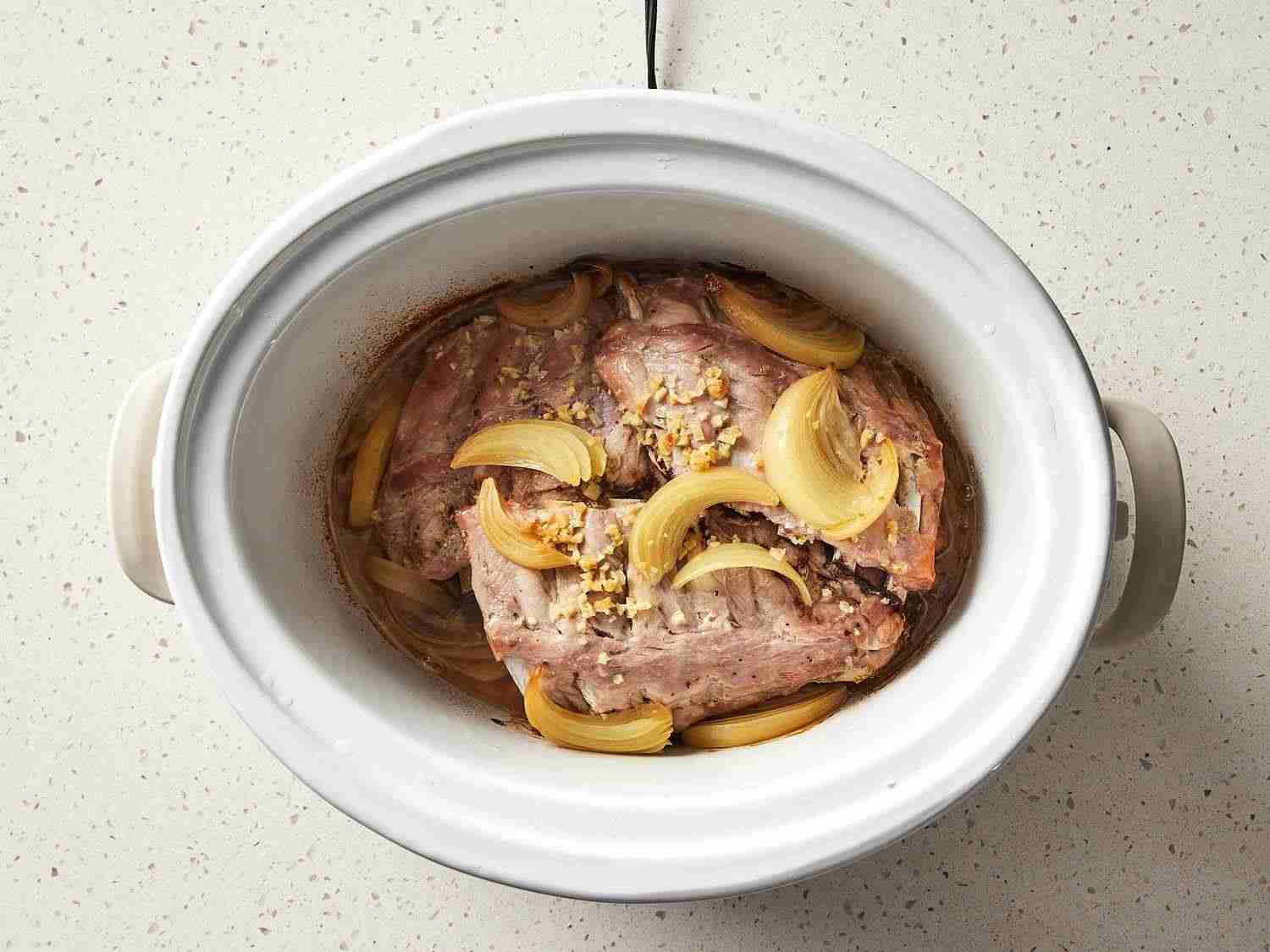 Pour 1/2 cup water into the slow cooker, then add ribs. Scatter onion and garlic over top. Cover and cook on Low for 8 hours or High for 4 hours. Dotdash Meredith Food Studios