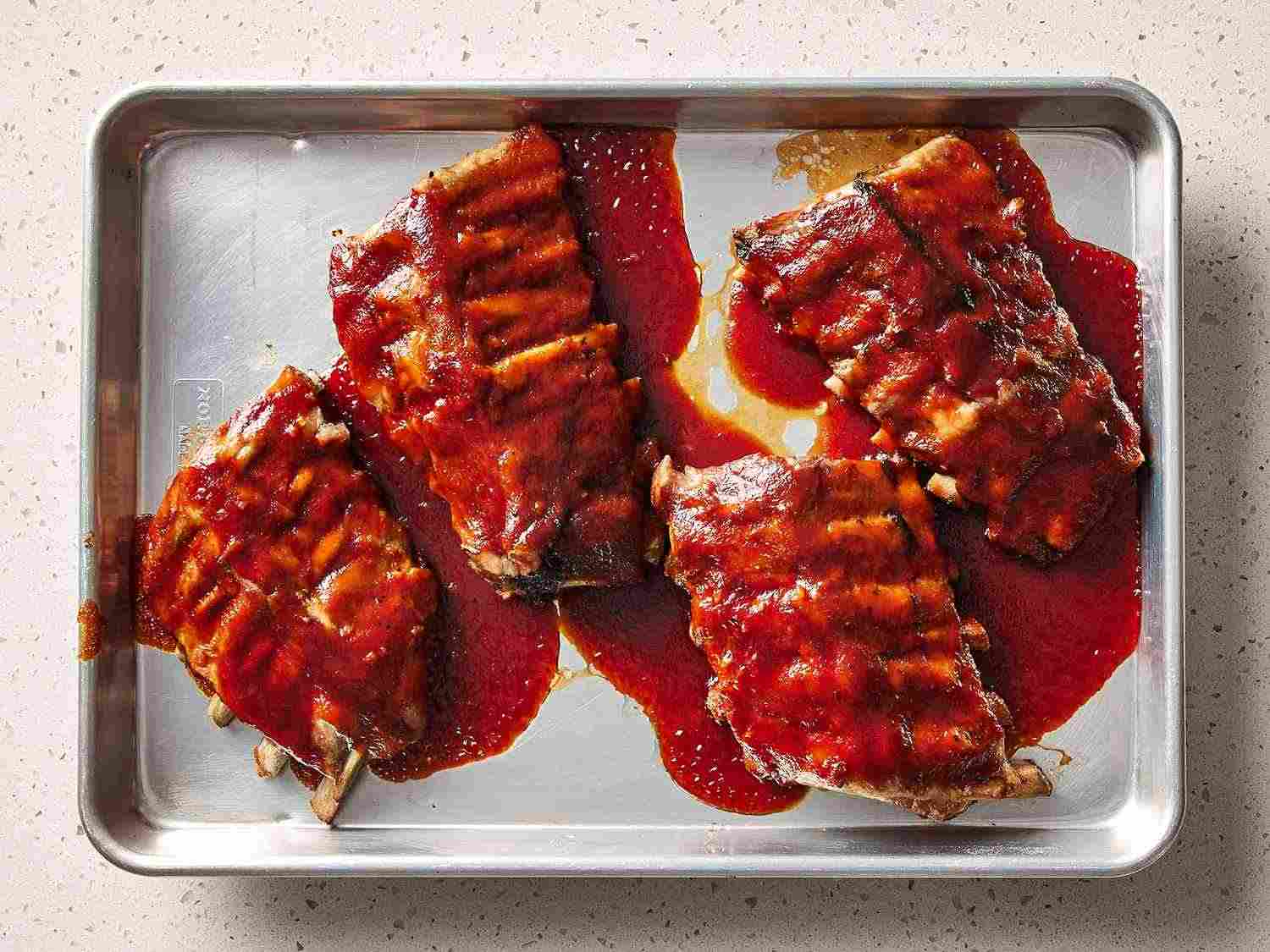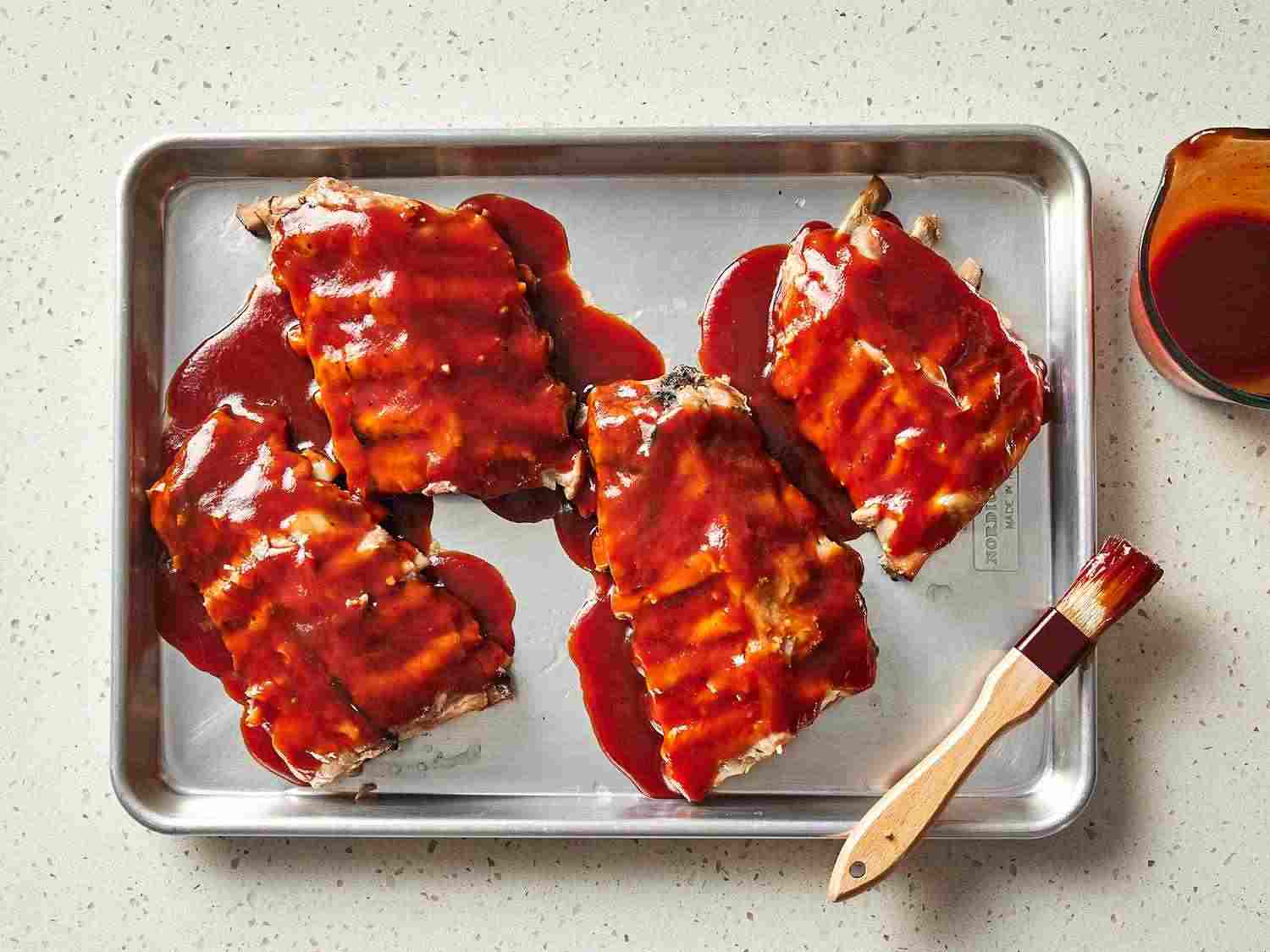 Bake ribs in the preheated oven until sauce caramelizes and sticks to meat, 10 to 15 minutes. Dotdash Meredith Food Studios
