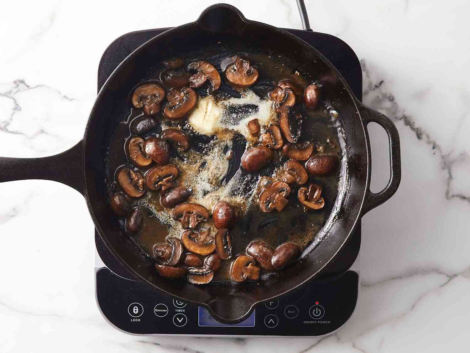 - Step 7:Set skillet on the stovetop over medium-high heat; cook and stir mushrooms until brown bits start to form on the bottom of the pan, about 5 minutes. Pour water into the skillet, and bring to a boil while scraping the browned bits off of the bottom of the pan. Cook until water is reduced by half, about 2 minutes. Remove from heat. Dotdash Meredith Food Studios
